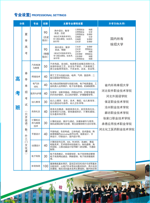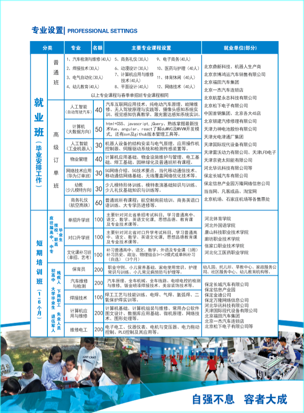学校师资力量雄厚,教职工具有本科以上学历占90%,在人才培养模式方面。我校为学生提供就业和升学双途径。学校为了让每名学生成为复合型人才,采用容大中学多年的全封闭教学模式。保证每位学生在校期间能够学到实用型的真技术,我们拥有长期稳定的专业实训基地。为保障校外教学实习的良好效果,使学生从理论知识,专业技能、职业道德与素质方面都得到适应企业实际需求的培养和提高,真正实现了学生一出校门即能顺利转变为企业员工的良好循环。学校积聚了由国有、民营、外资企业松成的就业资源,就业率达到了96%以上,同时依据多年跟国外的业务联系,建立了友好关系,满足学生出国留学就业的需求,如:俄罗斯、韩国、泰国、马来西亚、日本等。保障学生走向社会有立足之地,能够独立工作,学校欢迎社会各界人士前来我校参观考察。