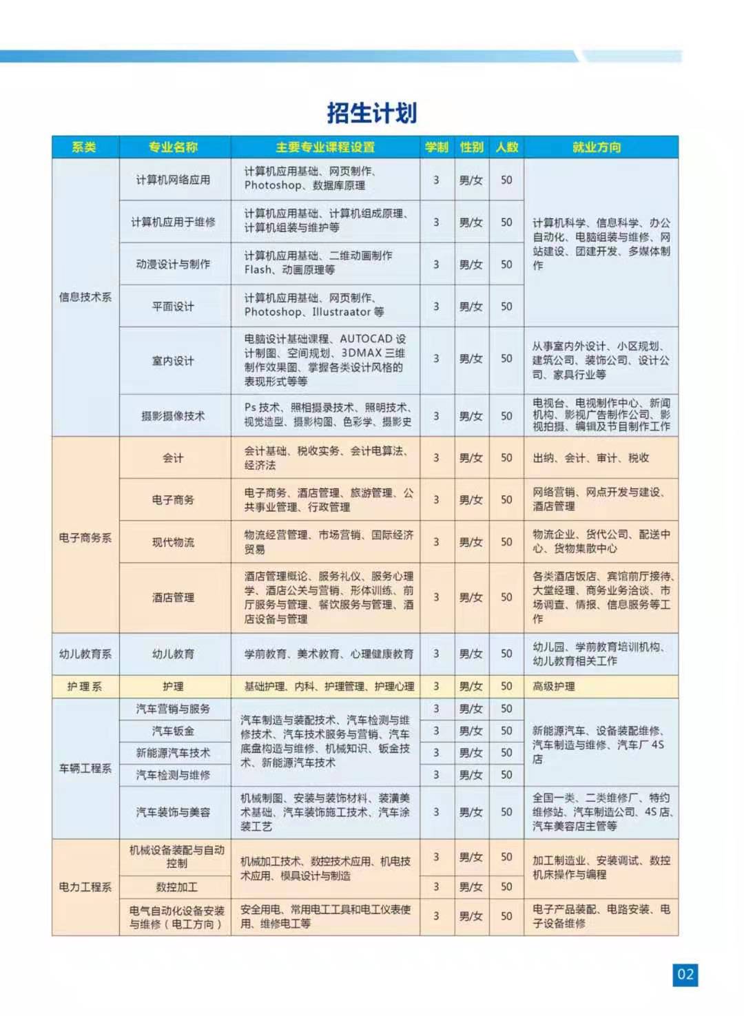 学校占地 50亩,建筑面积 20000多平方米,建有行政楼、教学楼、综合楼、学生公寓、餐厅等。开设幼儿教育、计算机网络应用、护理、电子商务、汽车维修、电气自动化设备安装与维修等专业。微机室、护理实训室、形体室、画室、琴房、汽修实训车间等功能室满足了教学实训的需要,堪称“技工人才的摇篮,放飞理想的胜境”。