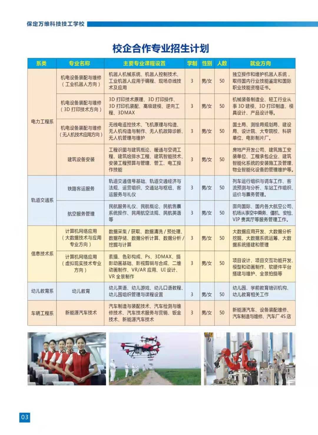 保定万维科技技工学校始建于1990年,是经河北省人力资源和社会劳动保障厅批准的重点技工学校,国家职业技能鉴定单位。获得省级文明单位、十佳和谐校园、综合先进单位、市级文明单位等荣誉称号。